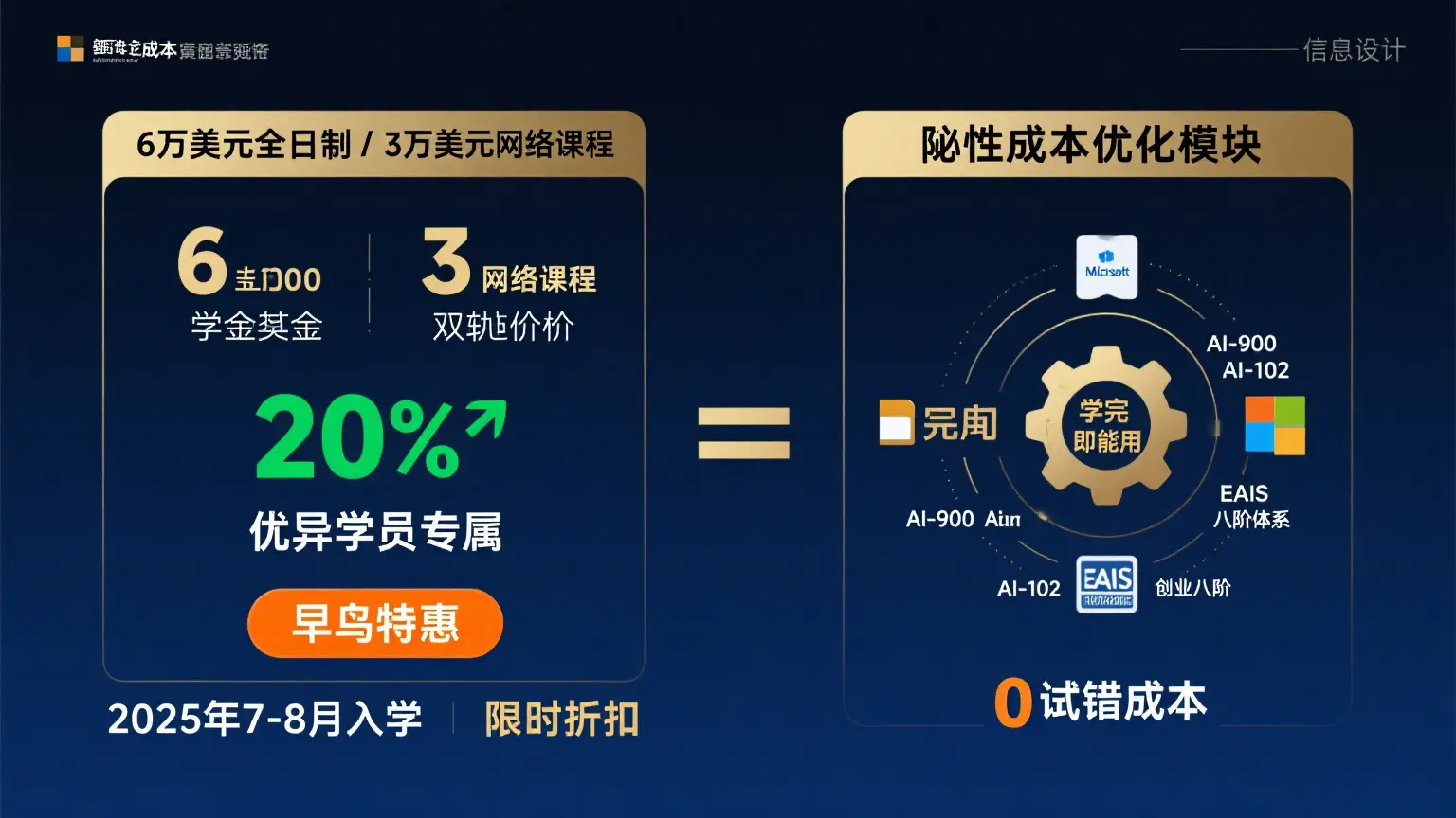 在顯性成本方面,課程提供“全日制6萬美元/網路課程3萬美元”的雙軌定價,同時為全日制優異學員設置20%的獎學基金,直接降低經濟壓力。更具吸引力的是,2025年7-8月入學的學員可享受限時折扣,實際費用大幅降低,讓優質教育資源的門檻進一步下沉。