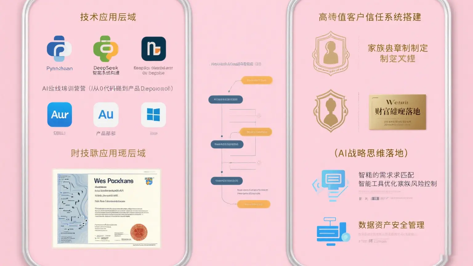 財富管理領域則實現了“傳統智慧+AI工具”的融合。課程既涵蓋高淨值客戶信任系統搭建、家族憲章制定等“軟實力”,又通過“AI戰略思維落地”“數據資產安全管理”等內容,讓學習者掌握用技術提升財富管理效率的方法——比如用AI實現精准客戶需求匹配,用智能工具優化家族信託的風險控制,這種“人文+技術”的複合能力,正是當下財富管理行業的核心訴求。