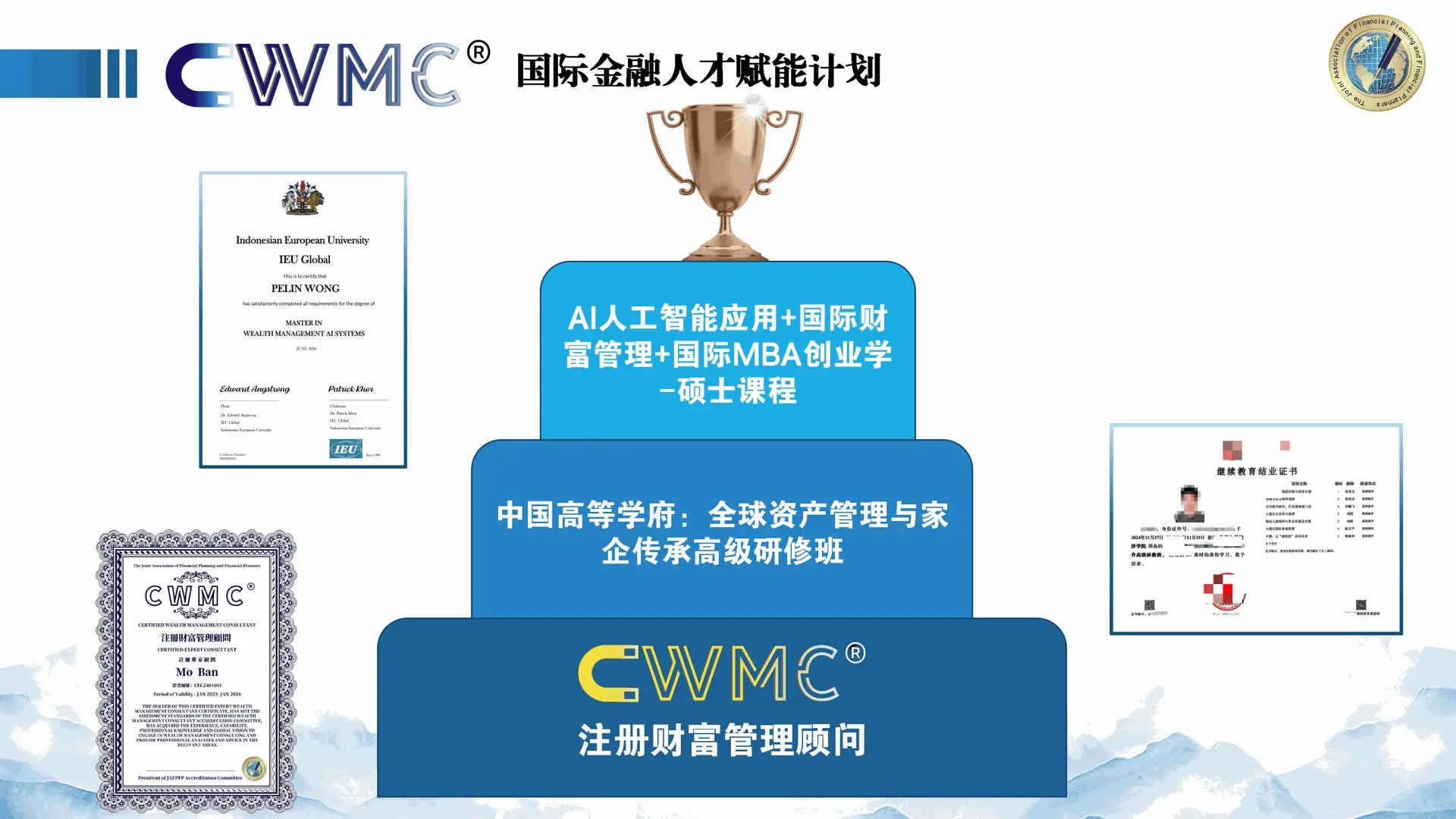 全球首創“AI人工智慧應用+環球財富管理+國際MBA創業學”碩士專案,學員將同時收穫IEU Global(印尼歐洲大學)碩士學位與CWMC高級認證,成為具備“多國視野(中國、東南亞、全球)”的頂級人才。