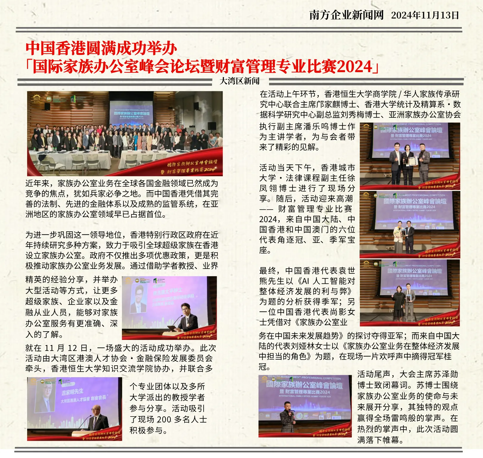 中國香港圓滿成功舉辦「國際家族辦公室峰會論壇暨財富管理專業比賽2024」——南方企業新聞網