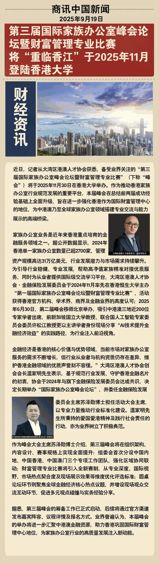 第三屆國際家族辦公室峰會論壇暨財富管理專業比賽將“重臨香江”于2025年11月登陸香港大學